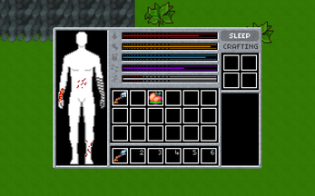 The final product contains one procedurally generated level, implements a simple crafting mechanic, a complex health system inspired by the Silmarils' duology Robinson's Requiem (1993) and Deus (1996), and a basic stealth mechanic. However, despite the presence of an energy bar and a sleeping button, such feature ended up not being implemented.